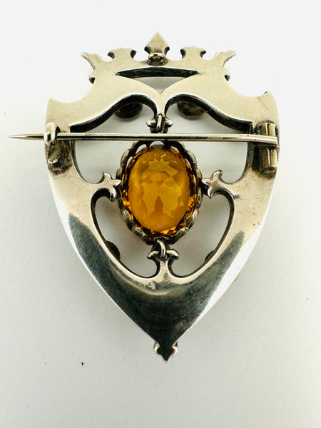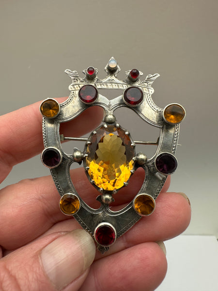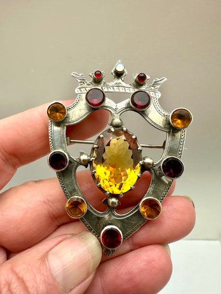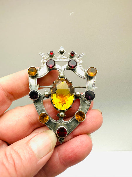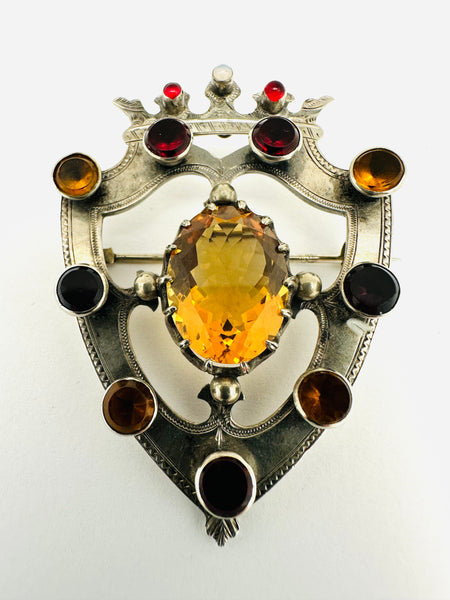 Antique Scottish shield brooch . The brooch is beautifully handcrafted in sterling silver . Sterling collets bezel set with alternating genuine garnets and citrines. The brooch is center set with a faceted 15ct citrine , crowned with a cabochon opal flanked by cabochon garnets . The brooch measures 2 1/2” long by 1 3/4” wide . The pin back is secure and sturdy . The shield is beautifully hand engraved . We date the brooch circa 1870 legal antique . All stones are original and no repairs to note .